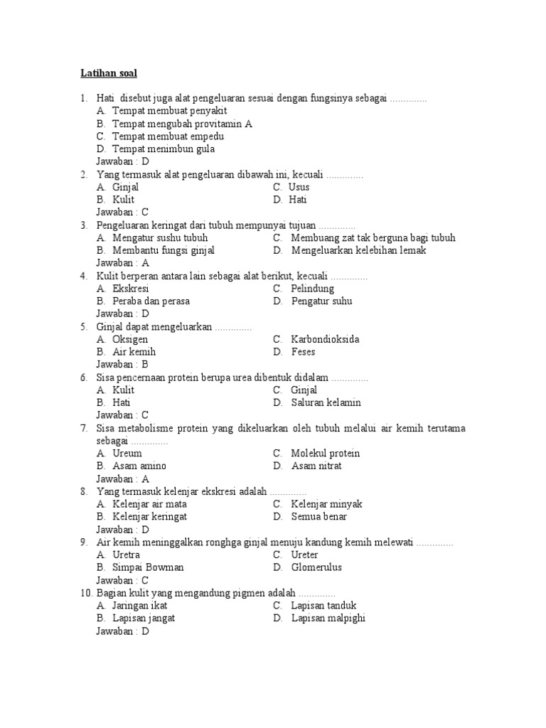 Proses pegeluaran zat sisa metabolisme yang sudah. Mengeluarkan sisa-sisa metabolisme yang masih dibutuhkan oleh tubuh C. Setiap soal dan kunci jawaban sistem ekskresi bisa anda download dalam bentuk pdf atau dokumen melalui link yang sudah kami sediakan dibagian bawah.