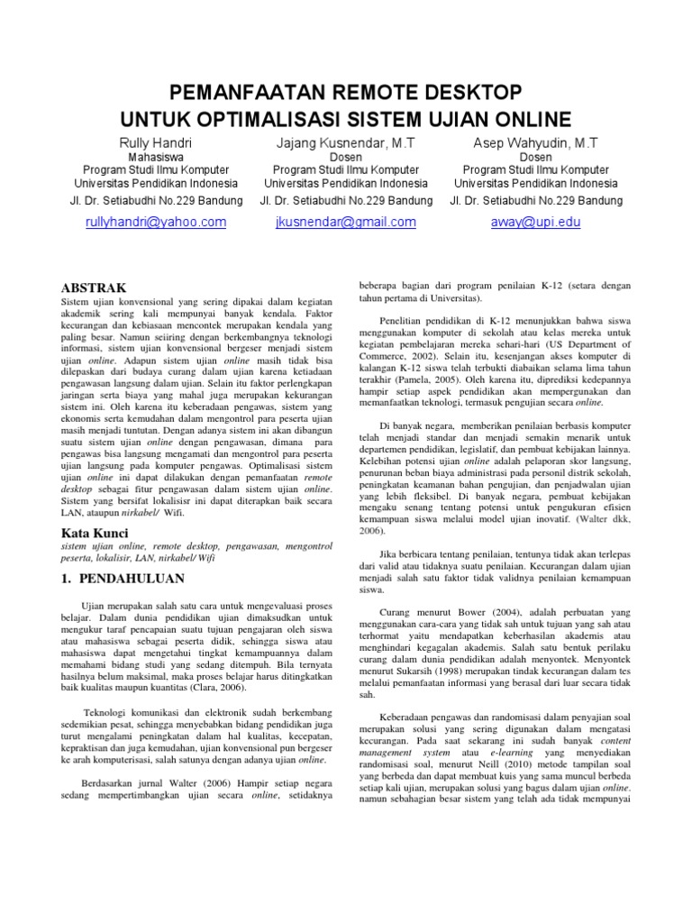 Pengembangan model Computer Based Test CBT diharapkan dapat mengurangi keterbatasan PBT. 2086 - 972X Vol9 No1 Juni 2017 37 PERANCANGAN EVALUASI MANDIRI BERBASIS KOMPUTER DENGAN METODE PENGACAKAN BANK SOAL PADA MATERI JARINGAN KOMPUTER MENGGUNAKAN ACTIONSCRIPT 20 Dhany Faizal Rachma Program Studi Sistem Informasi STIKOM Yos Sudarso Purwokerto Jl. Selain itu ujian tidak hanya dilakukan bagi yang telah mendapat pembelajaran namun ujian juga dilakukan dengan tujuan mendapatkan posisi tertentu dalam suatu instansi.
