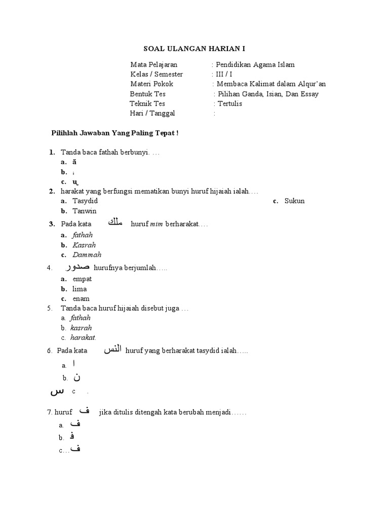 Kakak ingin berbagi beberapa contoh soal Latihan Ujian Akhir Semester untuk mata pelajaran Pendidikan Agama Islam atau sering disebut degan PAI. Ta marbutah yang mati atau yang mendapat harakat sukun ditransliterasikan dengan. Soal Essay 1-5 1.